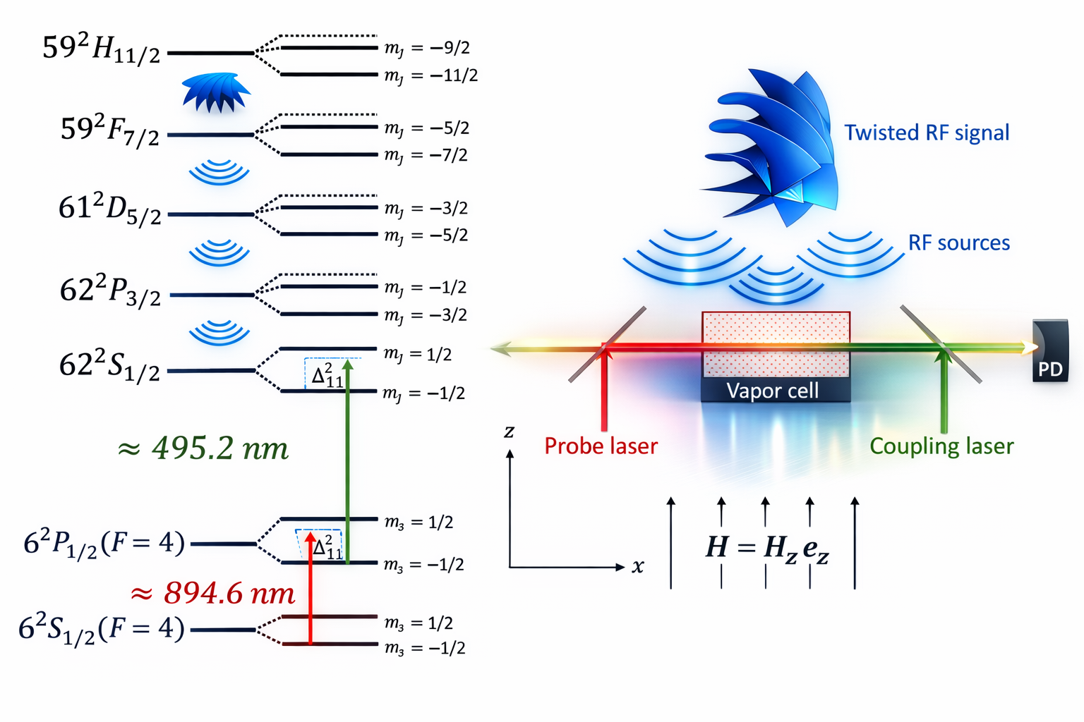 Авторы показывают, что ридберговские атомы чувствительны не только к мощности радиоволны, но и к её пространственной структуре. Если радиоволна несёт орбитальный угловой момент, то она возбуждает в атомах особые квантовые состояния, зависящие от «закрученности» волны. Главную роль здесь играет квантовая когерентность — согласованная связь между атомными уровнями, возникающая под действием лазеров и радиочастотного поля. Проще говоря, атом начинает «помнить» фазу внешнего поля, и эта информация проявляется в оптическом отклике среды.