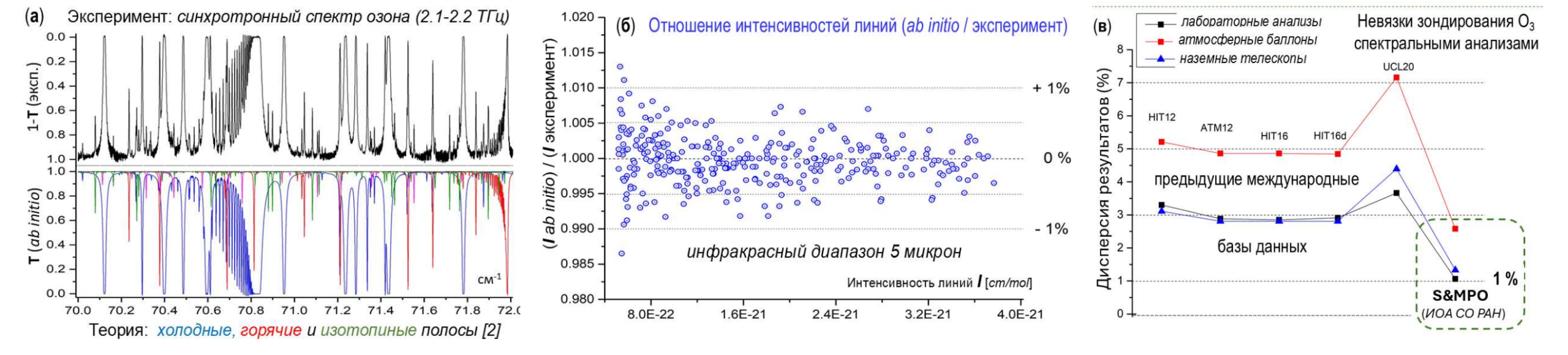 Впервые выполнены ab initio расчёты абсолютных интенсивностей линий с точностью лучше 1 % для сильных полос в терагерцовом и инфракрасном диапазонах. Эти расчёты были подтверждены серией совместных высокоточных экспериментов, проведённых в коллаборации с CNRS (Франция) и DRL (Германия). В результате сформирован уникальный массив данных, включающий точный набор 28 572 квантовых уровней энергии основного электронного состояния молекулы озона вплоть до 96,7 % порога диссоциации D0.